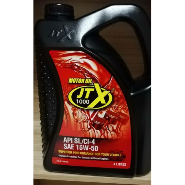 Jtx 1000 slci-4 sae15w50 multi grade. - Melebihkan jangka hayat engine dan kuasa engine. Bagi JTX1000 Gold Lapisan Pelindung Khas iaitu Tribologi Clear Film TCF dan Extreme Pressure EP yang diformulasikan Bagi Melindungi Setiap Permukaan yang Berpotensi Kepada Geseran dan Mampu Bekerja Walaupun Enjin Kehilangan Minyak Pelincir Akibat Kebocoran.